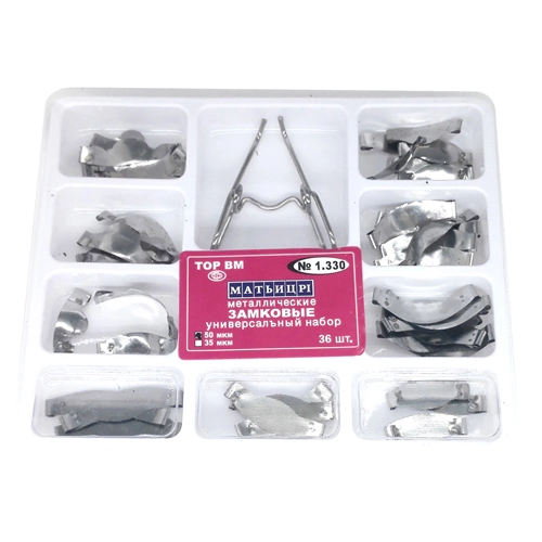 ماتریکس سکشنال زین اسبی - Saddle Contoured Metal Matrices:این ماتریکس سکشنالها به بازسازی آناتومی دندان و حفظ نقاط تماس آن با دندانهای اطراف کمک میکنند. علاوه بر این دارای قابلیت اتوکلاو و استریل نمودن است.ماتریکس سکشنال زین اسبی (Saddle) از برند TorVM در باکسهای 12 عددی محتوی نوار ماتریسهای Small، Medium و Large با ضخامت 50 میکرون در فروشگاه اینترنتی دندانت عرضه میشود.