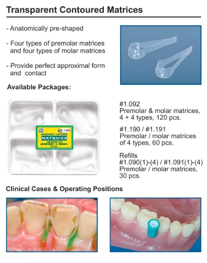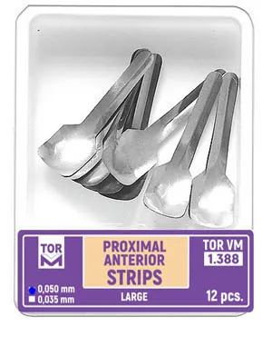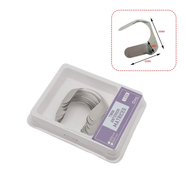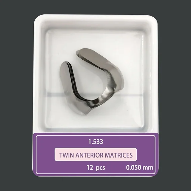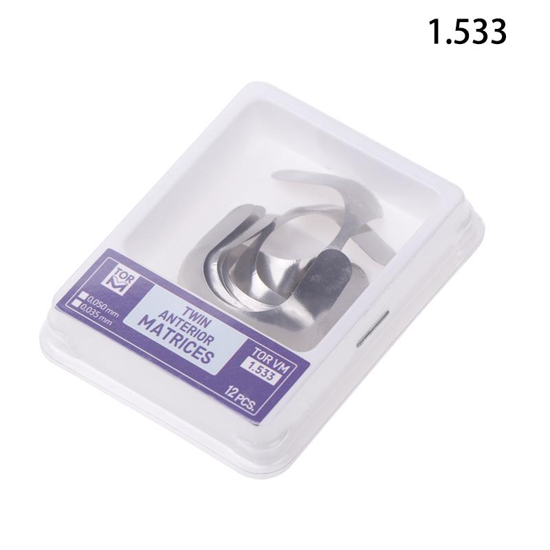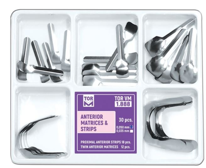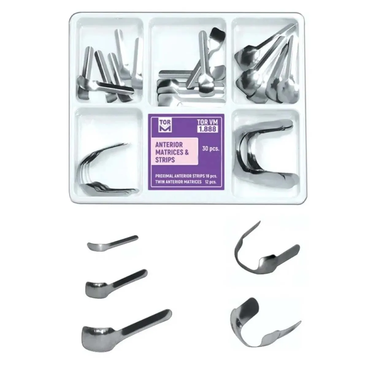 نوار ماتریکس قدامی فرم داده شده - Twin Anterier Matrices:نوار ماتریکس قدامی ایدهآل برای انجام ترمیمهای مستقیم پوسیدگی های کلاس III، IV، V و ترمیمهای زیبایی مانند ونیرهای کامپوزیت مستقیم و اصلاح شکل دندانهای سنترال انسیزور فک بالا است. ماتریکس قدامی به لطف شکل کانتوری خود اجازه می دهد تا لبه های پروگزیمال و سرویکال حتی در حضور رابردم و نخ زیرلثه به طور همزمان ترمیم شوند، بنابراین زمان لازم برای ترمیم کاهش مییابد. علاوه بر این، پس از قرار گرفتن، ماتریس قدامی اجازه میدهد تا شکل نهایی ترمیم را حتی قبل از شروع عمل تجسم کنید.نوار ماتریکس قدامی فرم داده شده مدل 1.523 از برند روسی TorVM در بستههای 12 عددی در فروشگاه اینترنتی دندانت عرضه میشود.