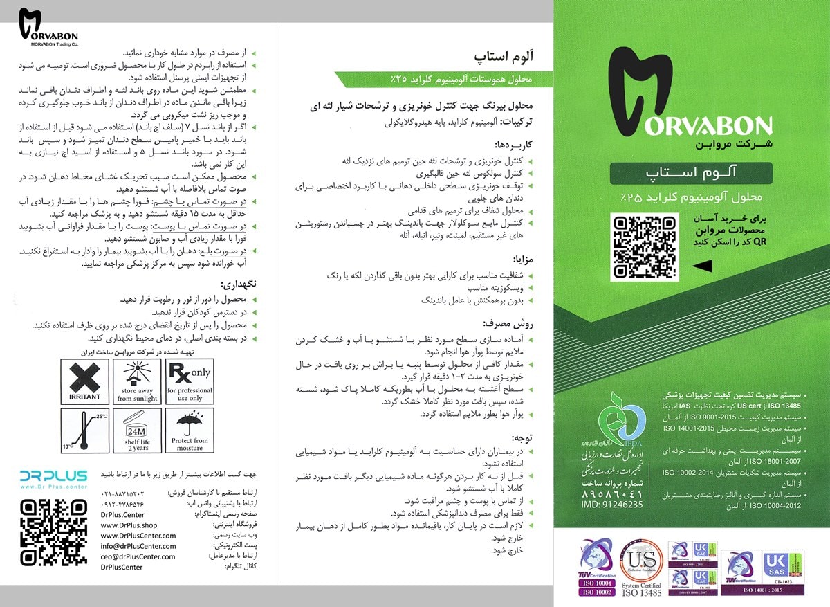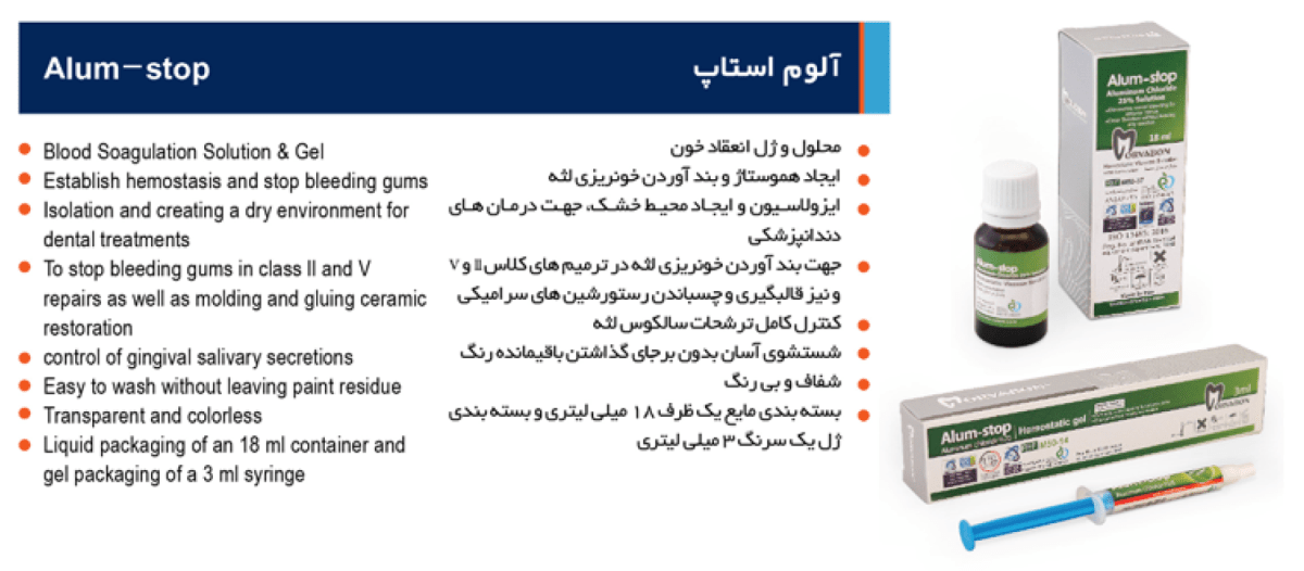 توضیحاتمعرفی و خرید هموستاپ ژل انعقاد خون – :Alumstopجهت ایجاد هموستاز و بند آوردن خونریزی لثه در ترمیمهای کلاس ll وV ، قالبگیری و چسباندن رستورشینهای سرامیکی کابرد دارد.شفاف و بیرنگ بودن و شستشوی آسان بدون بر جای گذاشتن باقیمانده رنگ از ویژگیهای این محصول محسوب میشود.بصورت ژل و با قوام مناسب و قابل کنترل در محیط دندان قابل استفاده است .هموستاپ ژل انعقاد خون مروابن حاوی آلومینیوم کلراید 25٪ میباشد.ژل انعقاد خون موجب کنترل کامل ترشحات سالکوس لثه میشود.هموستاپ ژل انعقاد خون مروابن به صورت 1 عدد سرنگ 3 میلیلیتری عرضه میگردد.ویژگیهای هموستاپ ژل انعقاد خون – Alumstop:– شفاف و بیرنگ– حاوی آلومینیوم کلراید 25٪– کنترل کامل ترشحات سالکوس لثه– شستشوی آسان بدون بر جای گذاشتن باقیمانده رنگ– مناسب برای ایجاد هموستاز و بند آوردن خونریزی لثه در ترمیمهای کلاس ll وV ، قالبگیری و چسباندن رستورشینهای سرامیکی– وزن: 3 میلیلیتر– محتویات بسته: 1 عدد سرنگ 3 میلیلیتری**می توانید از کد تخفیف برای خرید این محصول استفاده کنید.