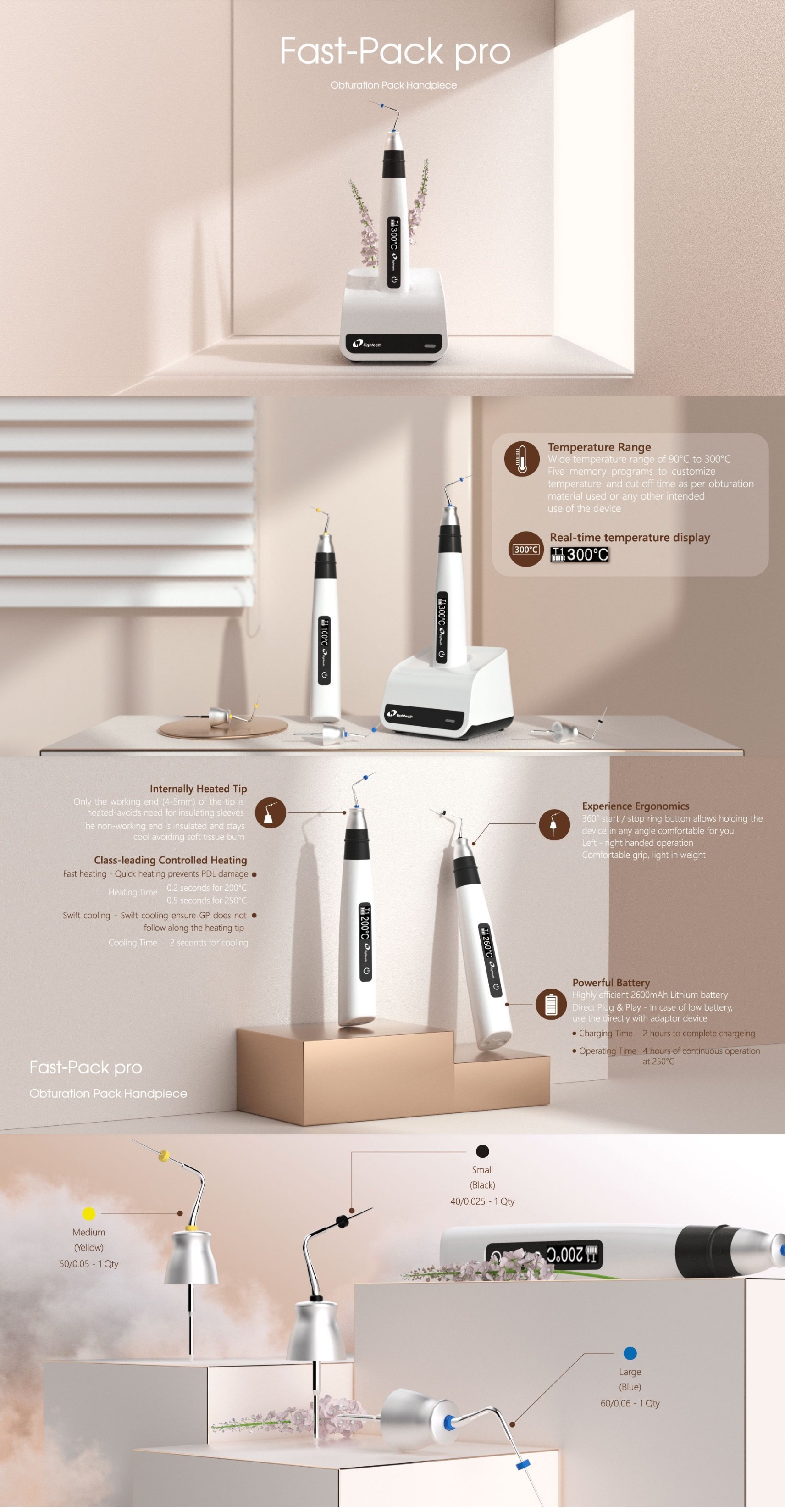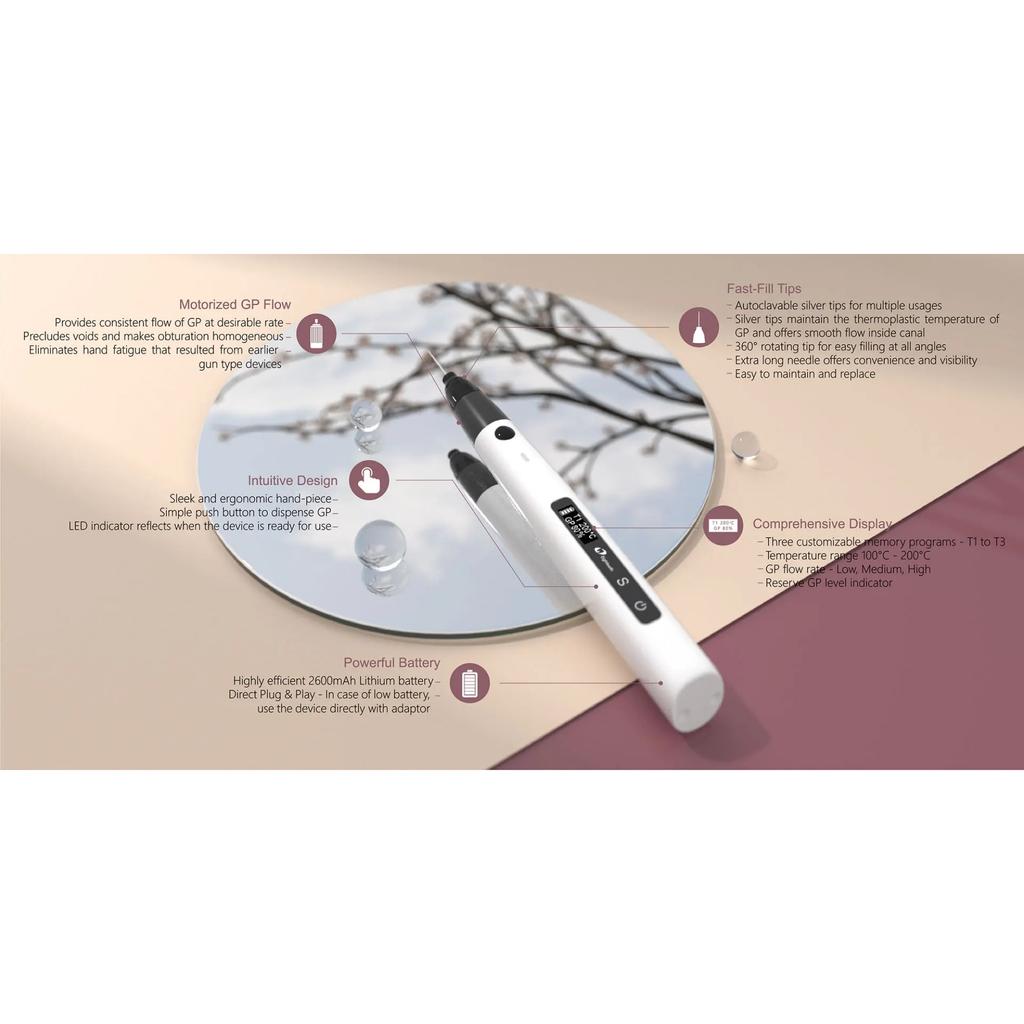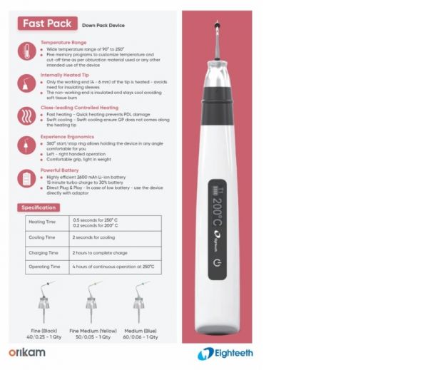 توضیحاتسیستم آبچوریشن ایتیس Eighteeth مدل فست پک Fast Pack:سیستم آبچوریشن Fast-Packتنها انتهای تیپ گرم می شود، در نتیجه نیازی به استفاده از عایق های حرارتی نیست.قسمتی که استفاده ای از آن نمی شود از درون عایق کاری شده، در نتیجه خنک باقی میماند این سیستم هم به آسایش هر چه بیشتر بیمار کمک می کند و هم موجب صرفه جویی در مصرف باتری می شود.کلاهک ایمنی که در دستگاه تعبیه شده است ، باعث ایمنی هر چه بیشتر در هنگام تعویض تیپ می شود.افزایش سریع دما از آسیب های PDL جلوگیری می کند قابلیت سفارشی سازی دما و زمان برای مواد آبچوریشن استفاده شده در دستگاهپیشگام در کنترل حرارتگرم شدنتنها 0.2 ثانیه تا رسیدن به 200 درجه سانتی گرادتنها 0.5 ثانیه تا رسیدن به 250 درجه سانتی گرادخنک شدنتنها 2 ثانیه برای خنک شدن کاملسیستم خنک کننده سریع (Swift) بلافاصله از حرکت گوتا پرگا جلوگیری می کند.ارگونومی بی نظیرامکان استفاده در 360 درجه برای راحت ترین زاویه کاریامکان استفاده برای راست دست و چپ دستبه راحتی در دست جای می گیردوزن سبکباتری فوق العاده قدرتمندباتری لیتیوم یون با کارایی بالا که عمر آن را افزایش می دهد2 ساعت برای شارژ کامل15 دقیقه با استفاده از توربو شارژ ( در این حالت شارژ به 30% می رسد)4 ساعت کار مداوم با درجه حرارت 250 درجه سانتی گراد50 مورد درمان تنها با یک نوبت شارژامکان اتصال مستقیم دستگاه به شارژر در زمانیکه شارژ دستگاه به صفر رسیدهمحدوده حرارتی وسیع:قابلیت تنظیم دما بین 90 تا 250 درجه سانتی گراددارای ۵ برنامه قابل تنظیم برای سفارشی سازی دماافزایش سریع دما تا ۲۵۰ درجه سانتی گراد:تنها 0.2 ثانیه تا رسیدن به 200 درجه سانتی گرادتنها 0.5 ثانیه تا رسیدن به 250 درجه سانتی گرادافزایش سریع دما از آسیب های PDL جلوگیری می کندقابلیت سفارشی سازی دما و زمان برای مواد آبچوریشن استفاده شده در دستگاهسیستم خنک کننده:تنها 2 ثانیه برای خنک شدن کاملسیستم خنک کننده سریع (Swift): سریعا تزریق گوتاپرگا را متوقف می نماید.ارگونومی بی نظیرامکان استفاده در 360 درجه برای راحت ترین زاویه کاریاستفاده برای راست دست و چپ دستبه راحتی در دست جای می گیردوزن سبکباتری فوق العاده قدرتمندباتری لیتیوم یون، با کارایی بالا موجب افزایش عمر دستگاه می گردد2 ساعت برای شارژ کامل15 دقیقه با استفاده از توربو شارژ ( در این حالت