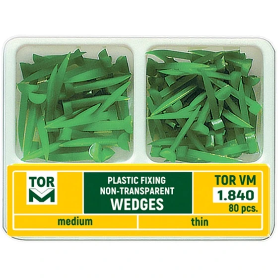 کیت وج پلاستیکی سبز - Plastic Fixing Non Transparent Wedege:جهت ثابت نگه داشتن ماتریکسبند در محل در امتداد لبه لثهای حفرههای کلاسII،حفظ حریم لثه و جدا کردن دندانهای مجاور کاربرد دارد و در ناحیه امبرژوال لثهای قرار داده میشود.از جمله مزایایی که میتوان برای وجهای دندانپزشکی بیان کرد این است که نیازی به برش و یا تنظیمات خاصی ندارد و در هر شرایطی ماتریکسبند را ثابت نگه میدارد.کیت وج پلاستیکی سبز و 80 عددی مدل 1.840 از برند روسی TorVM در بستههای حاوی 30 عدد وج معمولی + 50 عدد وج باریک در فروشگاه اینترنتی دندانت عرضه میشود.