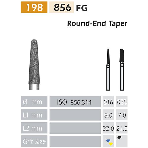 فرز الماسی مدل مخروطی توربین فرم 198 - Dental Diamond Burs 856:این فرز در آماده سازی تاج و Inlay/Onlay و خالی کردن پرکردگیهای قدیمی مورد استفاده قرار میگیرد.فرز الماسی مدل مخروطی ته گرد توربین برندDFSبارنگ مشکی و قطر 016در بسته بندی 5 عددی عرضه میگردد.
