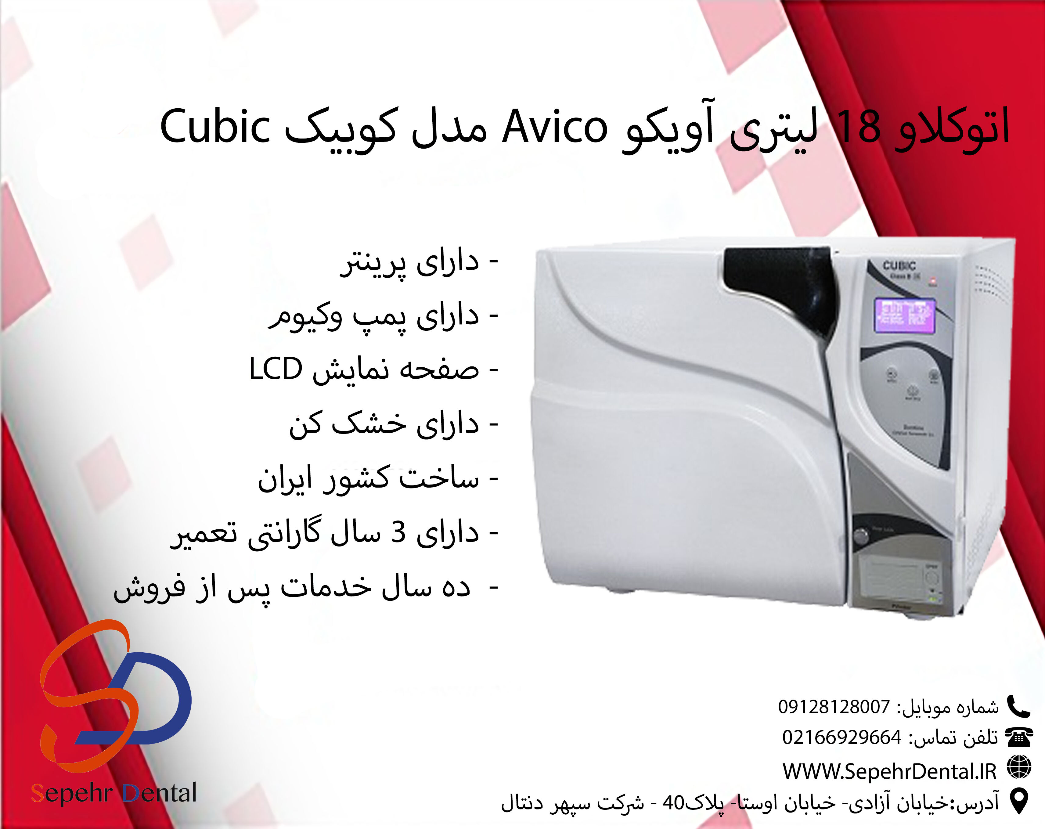توضیحاتاتوکلاو دندانپزشکی چیست؟ و چه کاربردی دارد؟اتوکلاوها یکی از پرکاربردترین و پرمصرفترین دستگاهها در زمینه پزشکی و استریل کردن وسایل در نظر گرفته میشوند. اتوکلاوها با استفاده از بخار، تجهیزات را استریل میکنند.روش کار با استفاده از این دستگاهها به این صورت است که تجهیزات به طور کامل درون دستگاه قرار میگیرند و سپس درب دستگاه بسته میشود و با استفاده از بخار و دمای 100 درجه سانتیگراد، تمام وسایل از هر گونه میکروب پاک میشود.اتوکلاو دندانپزشکی یک روش استریلیزاسیون دندانپزشکی میباشد که نسبت به سایر روشها نه تنها امنتر میباشد بلکه بسیار سریعتر نیز میباشد. اتوکلاو یکی از تجهیزات مورد نیاز در اکثریت مراکز درمانی میباشد. جدا از وسایل یکبار مصرف، سایر وسایل و ابزار دندانپزشکی، برای استفاده مجدد باید طی چرخه استریلیزاسیون آماده شوند.عمده روش استریل کردن لوازم دندانپزشکی نیز استفاده از حرارت مرطوب یا اتوکلاو میباشد. از سالها پیش استفاده از اتوکلاو کلاس B در مراکز دندانپزشکی توسط وزارت بهداشت الزامی شده است. هرگز فراموش نکنید، برخی از مواد که از جنس پلاستیک هستند را نمیتوانید با استفاده از این دستگاه استریل کنید چرا این مواد به راحتی درون این دستگاه ذوب میشوند.اتوکلاو دندانپزشکی 18 لیتری آویکو Avico مدل کوبیک Cubicظرفیت 18 لیتردارای پرینتر مخصوص چاپ و مستندسازی تمامی پارامترهای اندازه گیری در زمان سیکلامکان قرار دادن هفت سینی داخل چمبر مکعبی با فاصله استانداردپمپ وکیوم دارد در 4 مرحله وکیوم قوی با ایجاد خلاء.دارای 6 برنامه از پیش ذخیره شده در دستگاه و سیستم وکیوم 6 مرحله ای سیکل استریل می باشد.دارای سیکل فلاش است و توسط کاربر قابل تنظیم می باشد.سیستم عیب یابی خودکار دارد.صفحه نمایش LCDخشک کن دارد.آبگیری دستی می باشد.تستر سختی آب ندارد.استاندارد ISOمشخصات و ویژگیاتوکلاو 18 لیتری آویکو Cubicاین اتوکلاو ایرانی بوده و ساخت شرکت فرازمهر می باشد. نحوه کار با این اتوکلاو بسیار سریع و آسان می باشد. اتوکلاو آویکو مدل کوبیک Cubic از نوع کلاس B می باشد که در دسته بهترین اتوکلاوهای دندانپزشکی قرار دارد.از ویژگی های دیگر اتوکلاو دندانپزشکی کوبیک cubic می توان به داشتن 6 سیکل استریل متفاوت است که در حافظه دستگاه ذخیره شده است. این دستگاه شامل 4 مرحله وکیوم است که خلاء ت