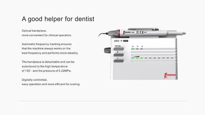 توضیحاتتوضیحات جرمگیر پیزوالتراسونیک وودپیکر WOODPECKER – UDS.J :۳ مدکاری جرمگیری، پریو، اندو دارد.فرکانس این دستگاه ۳۱ – ۲۵ کیلو هرتز میباشد.فشار آب ورودی این جرمگیر پیزو التراسونیک ۱-۵Bar است.مطابق با استانداردهایFDA, ISO آمریکا، CE اروپا، TUV آلمان در کشور چین تولید شده است.دارای هندپیس غیرفایبراتیک قابل اتوکلاو و قابل جدا شدن، آداپتور در وزن ۱.۲ کیلوگرم و ۵ عدد سرقلم میباشد.از دیگرامکانات این جرمگیر پیزوالتراسونیک میتوان به کالیبراسیون خودکار، آچار کلاج دار قابل اتو کلاو و قابلیت کار بدون آب اشاره کرد.جرمگیر پیزوالتراسونیک مدل UDS-J در وزن ۷۳۰ گرم و ابعاد ۱۹۰ *۱۲۵ *۶۰ میلیمتر عرضه میگردد.