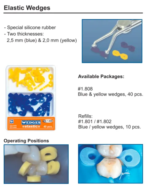 توضیحاتویژگیهای وج آناتومیک تک رنگ – Fixing Wooden Wedges :– مناسب جهت ثابت نگه داشتن ماتریکس بند در محل در امتداد لبه لثهای حفرههای کلاس II– حفظ حریم لثه و جدا کردن دندانهای مجاور– بدون نیاز به برش و یا تنظیمات خاصوج آناتومیک تک رنگ –Fixing Wooden Wedges:جهت ثابت نگه داشتن ماتریکس بند در محل در امتداد لبه لثهای حفرههای کلاسII،حفظ حریم لثه و جدا کردن دندانهای مجاور کاربرد دارد و در ناحیه امبرژوال لثهای قرار داده میشود.از جمله مزایایی که میتوان برای وجهای دندانپزشکی بیان کرد این است که نیازی به برش و یا تنظیمات خاصی ندارد و در هر شرایطی ماتریکس بند را ثابت نگه میدارد.وج آناتومیک تک رنگ TorVMدر بستهبندی ۱۰۰عددیراهنمایی رنگ بندی وج:نارنجی:خیلی نازک-خیلی کوتاه 1.181سفید”:نازک -کوتاه 1.182سبز :نازک -کوتاه1.183صورتی (متوسط -بلند) 1.186