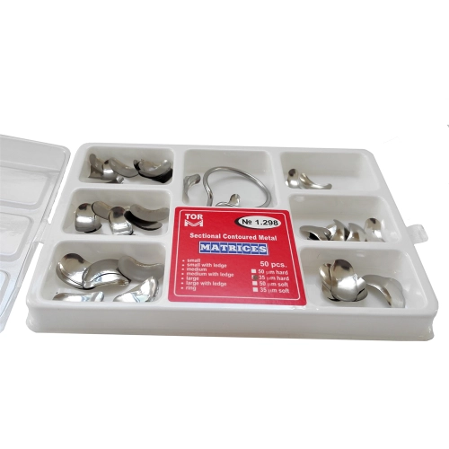 معرفی و خرید کیت سکشنال ماتریکس -Sectional Matrix Kit:به بازسازی آناتومی دندان و حفظ نقاط تماس آن با دندانهای اطراف کمک میکند.دارای قابلیت اتوکلاو و استریل نمودن میباشد.هر بسته شامل 50 عدد سکشنال ماتریکس در 6 سایز + کلمپ (رینگ) میباشد.****خرید تجهیزات دندانپزشکیبا بهترین قیمت و کیفیت از سایت دندانت ****