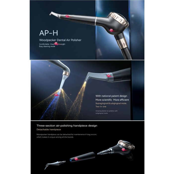 توضیحاتمزایای ایرفلو وودپیکر Woodpecker مدل A-PH Gun:طراحیکم حجم ،سبک و کاربر پسند استپودر معمولی وقدرتمند را با ساختار ورودی و خروجی شکل منحصر به فرد اسپری میکندبرای تمیز کردن و صیقل دادن دندان از طریق هوا، آب و پودر بسیار کار امد استتمیز کردن و ضدعفونی کردن دستگاه بعد از استفاده بسیار آسان استچرخش ۳۶۰درجه ،جهت تمیز کردن قسمت های غیر قابل دسترس در هر قسمت دنداناستریل کردن دستگاه در دمای ۱۳۵ درجه سانتی گرادروشی بی نظیر و بسیار سریع تر در پاکسازی پلاکهای دندانی است.این سیستم با ترکیب هوا، آب و بی کربنات سدیم عمل می کند.جریان پر فشار آب و هوا سطح جرم گرفته دندان ها را بسیار سریع تر و کارآمدتر از روش های سنتی پاکیزه می کند.این روش همچنین یک راه عالی و تکمیلی برای سفید کردن دندانها است. مزیت این نوع درمان این است که لکه ها را بدون آسیب رساندن به رنگ اصلی دندان ها برطرف می کند.درصورتی که اقدام شما برای جرمگیری با این روش به موقع باشد، لکه های ایجاد شده ناشی از مصرف چای، قهوه، نوشیدنی های رنگی، ادویه جات، دهانشویه های رنگی و دخانیات کاملا برطرف خواهند شد.معمولا استفاده از این روش قبل از انجام بلیچینگ دندان ها توصیه می شود. این روش هیچ گونه دردی در بیمار ایجاد نمی کند. بنابراین هیچ نیازی به تزریق بی حسی نیست. ضمنا سطح دندان را هم خراش نمی دهد.