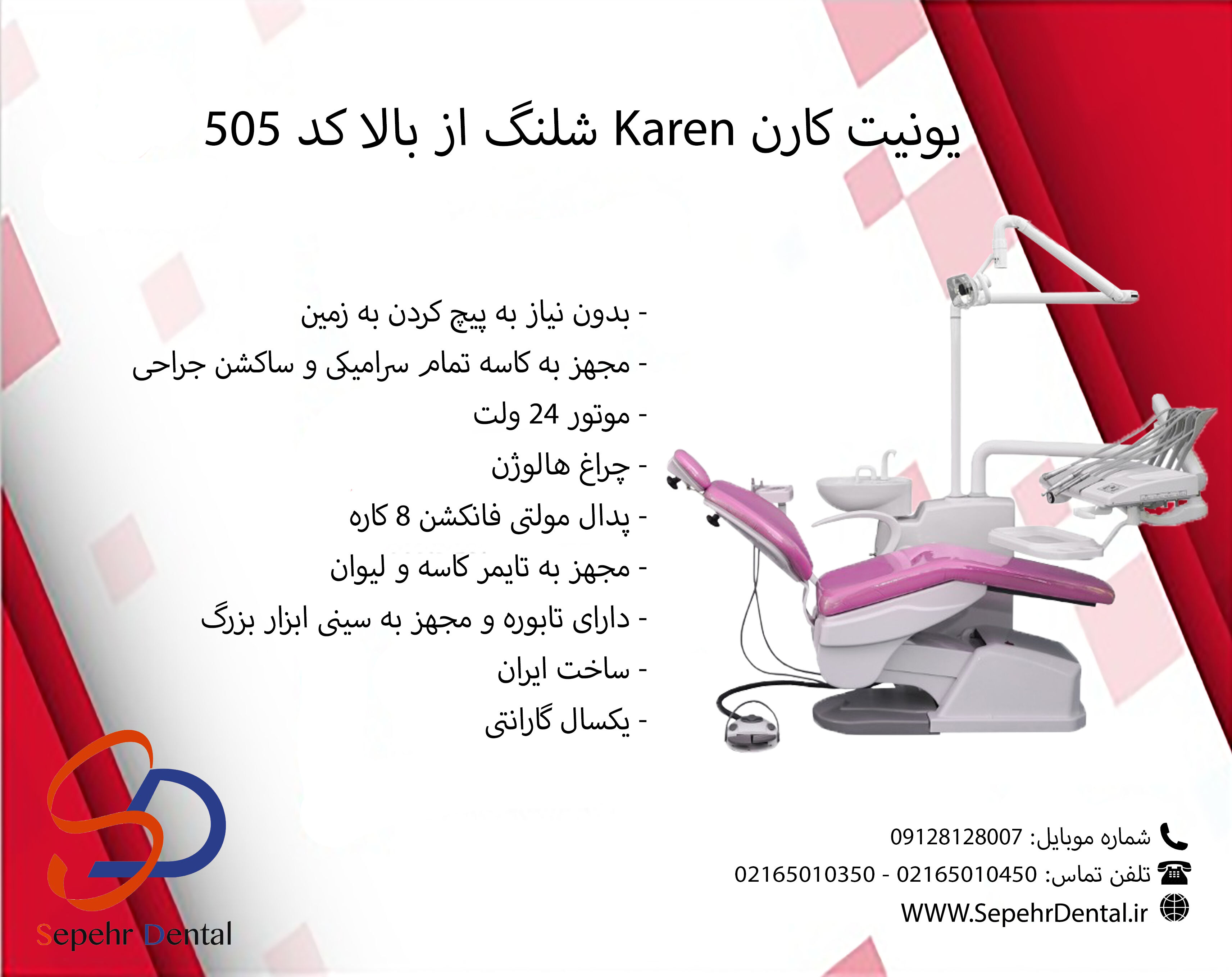 توضیحاتیونیت کارن 505یونیت کارن 505 با طراحی باکس اتصال به زمین طراحی شده است (بدون نیاز به پیچ شدن به زمین) که باعث استحکام بهتر استراکچر بر روی زمین و مقاومت بیشتر در برابر وزن بالای بیمار شده و موتور نیز با توجه به اینکه دیگر وزن باکس کراشوار، تابلت و چراغ را نباید جابه جا کند، طول عمر بیشتری نیز خواهد داشت.پدال مولتی فانکشن که یکی از ویژگی های اصلی یونیت کارت 505، داشتن قابلیت کنترل آب و هوا، کنترل پوزیشن صندلی، قعال کردن کاسه شور و لیوان پر کن است.یونیت دندانپزشکی کارن 505تابلت قرار گرفته بر روی یونیت دندانپزشکی کارن 505 در دو مدل شیلنگ از بالا و پایین طراحی شده است که دارای 4 اهرم نگهدارنده شیلنگ است که دو شیلنگ دو سوراخ و یک پوار بر روی آن قرار گرفته که میتوان جرمیگری داخل یونیتی نیز به صورت آپشنال بر روی تابلت متصل نمود.بر روی تابلت امکان تنظیم پوزیشن صندلی و تایمر کاسه کراشوار و لیوان پر کن و همچنین روشن و خاموش کردن چراغ قرار گرفته و زیر تابلت یونیت کارن نیز سینی برای قرار گیری ابزار ها نیز وجود دارد.ویژگی های یونیت کارن Karen مدل 505تابلت پزشک شیلنگ از بالا و ۳ شیلنگ ( توربین و آنگل و پوار )موتور صندلی ۲۴ ولت بیصدا و کم مصرفدارای ساکشن بزاق کش و جراحیپدال مولتی فانکشن ۶ کارهچراغ LED نور سفیدکاسه کراشوار سرامیکیدارای فیلتر آمالگامگیرمخزن آب اضطراریتنظیم تایم شستشو کراشوار و لیوان پر کنقطعات وارداتی و کیفیت بالاساخت کشور ایرانیکسال گارانتی و ۱۰ سال خدمات پس از فروشدلایل خرید یونیت دندانپزشکی کارن 505از دلایل خرید یونیت دندانپزشکی کارن 505 میتوان به داشتن قطعات وارداتی با کیفیت، خدمات پس از فروش در کلیه استان و همچنین امکانات مناسب در این یونیت دندانپزشکی اشاره کرد.قیمت یونیت صندلی دندانپزشکی کارن Karen 505قیمت یونیت صندلی دندانپزشکی کارن Karen 509 با توجه به اینکه این دستگاه دارای کیفیت مناسبی است، از جمله داشتن موتور 24 ولت، دارای حافظه صندلی و همچنین داشتن چراغ Led میتوان گفت آن را به یکی از محبوب ترین یونیت های دندانپزشکی تبدیل کرده است.یونیت کارن ۵۰۵ به عنوان اقتصادی ترین از برند یونیت دندانپزشکی کارن است که باتوجه به داشتن امکانات بسیار مناسب در قیمت خود، میتواند بهترین انتخاب برای دندانپزشکان باشد.