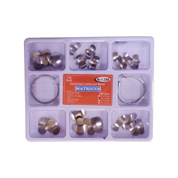کیت سکشنال ماتریکس 100 عددی - Sectional Matrix 1.398:به بازسازی آناتومی دندان و حفظ نقاط تماس آن با دندانهای اطراف کمک میکند.دارای قابلیت اتوکلاو و استریل نمودن میباشد.کیت ماتریکس سکشنال مدل (1.398)TorVMساخت روسیه در باکسهای محتوی 100 عدد ماتریکس سکشنال + یک عدد کلمپ ساده + یک عدد کلمپ آناتومیک در فروشگاه اینترنتی دندانت عرضه میشود.