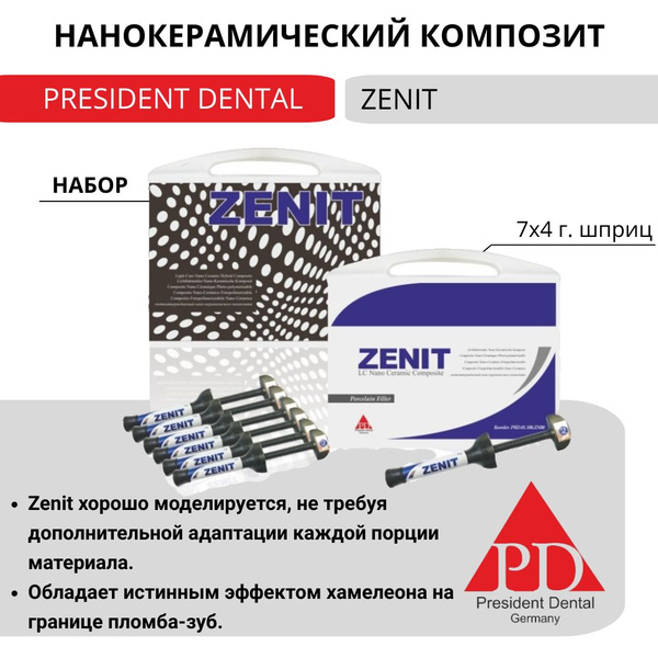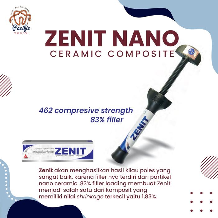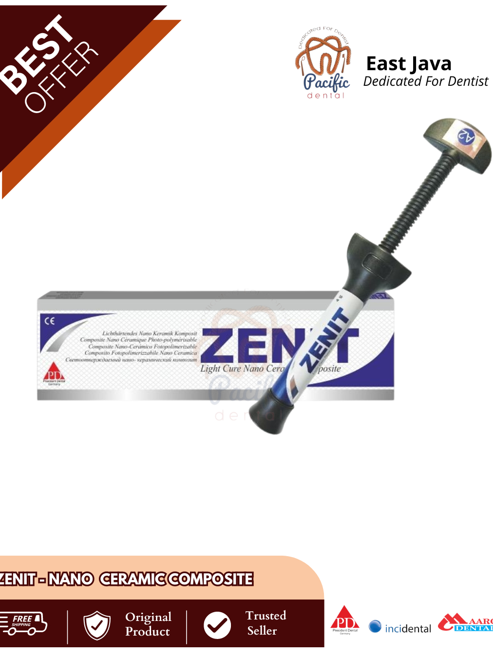 توضیحاتویژگی های کامپوزیت نانو سرامیکی زنیت PD- ZENIT:ترمیم های مستقیم قدامی و خلفی در حفره های کلاس I، II، III، IV و V سیاه و سفیدتنظیم خطوط و سایه برای بهبود زیبایینانو کامپوزیت مورد استفاده با لایت کیور با ویژگی های فیزیکی برجسته و کارایی بهینه سازی شدهفرمول پیشرفته جدیدکاهش انقباضکامپوزیت زنیت محتوای پرکننده بسیار بالای 83٪ سطح ذرات گسترش یافته و تراکم بالاتر می تواند بار بیشتری را تحمل کنداستفاده راحتپرکننده فوق العادهترمیم های بسیار همگنقابلیت پالیش بالامقاومت در برابر سایشانقباض پلیمریزاسیون کمترکامپوزیت زنیت بدون تغییر رنگ در طول زمان