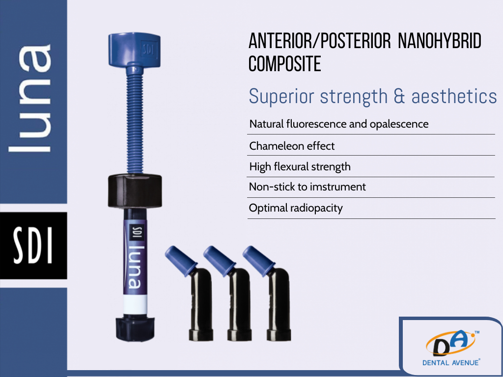 توضیحاتLuna Compositeکامپوزیت نانوهیبریدی قدامی و خلفی لونادارای مکرولیکیج و شرینکیج پایین ، رادیدواوپسیتی بالاعدم چسبندگی به اینسترومنت و استحکام فشاری بالادر تیوب های ۴ گرمی، دارای رنگ بندی :A1 , A2 , A3 , A3.5 , B1 , B2 , OA2 , OA3 , OA3.5 , Bleach , IncisalEA1 , EA2 , EA3 , EA3.5 , EB1 , EB2مناسب برای : ترمیم های کلاس ۱ و ۲ و ۳ و ۴ و ۵ ، ساخت کوربیلدآپ