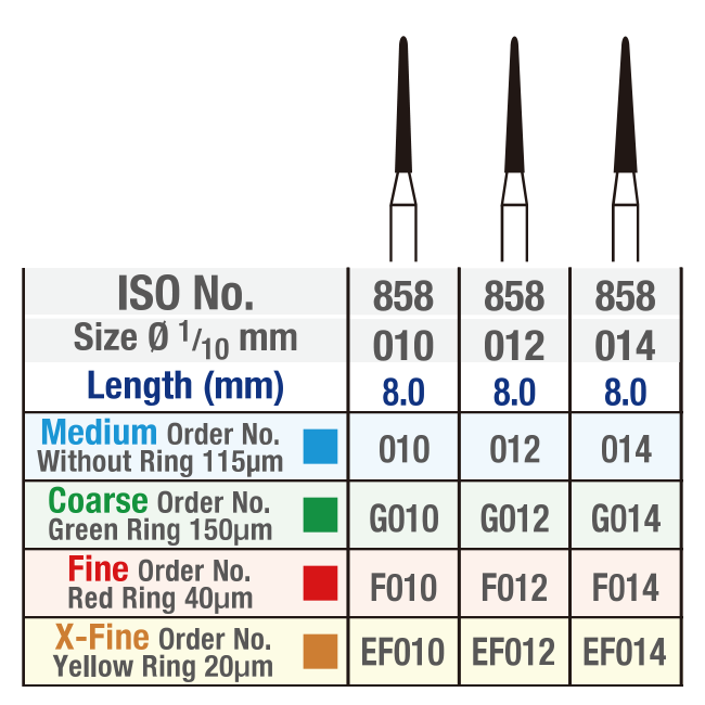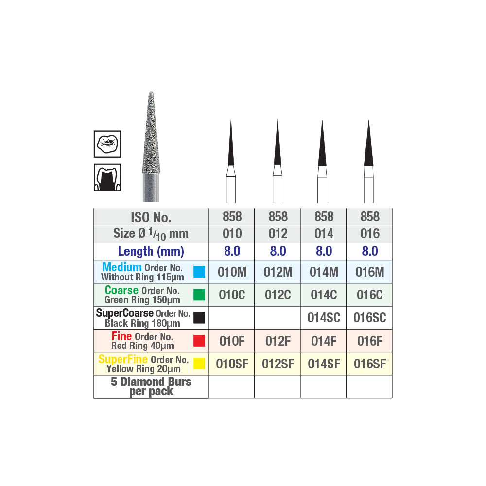 فرز الماسی مدل سوزنی توربین 5 عددی - Needle 858:در آماده سازی کانال کاربرد دارد.این فرز در ترمیم پرکردگیها و پیرایش سطح دندان مورد استفاده قرار میگیرد.فرز الماسی مدل سوزنی توربین برند سانی در بسته بندی 5 عددی عرضه میگردد.