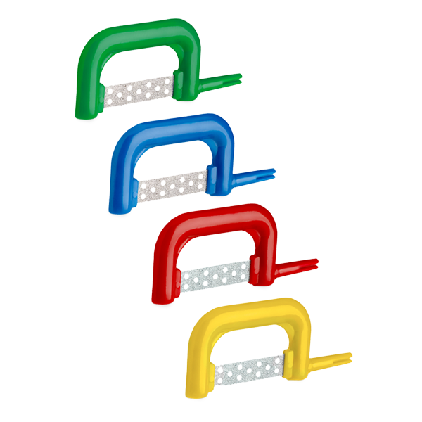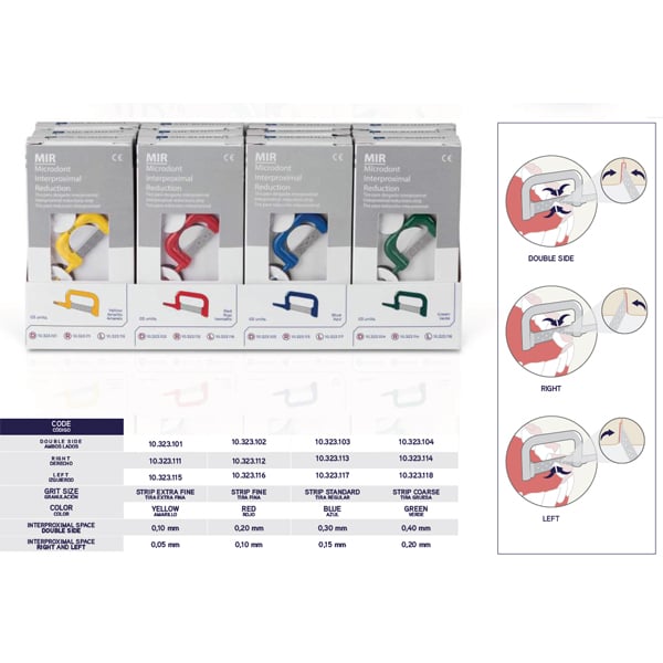سمباده بین دندانی MIR 1 - Interproximal Reduction Strip :با توجه به ضخامت کم نوار، کانتکت بسیار مناسبی ایجاد می کند.آیتم فوق قابل اتوکلاو می باشد که به دلیل کند شدن قسمت فولادی پیشنهاد می شود بیشتر از 2-3 بار اتوکلاو نگردد.در مدل های خیلی نرم (Exra Fine) و نرم (Fine) و استاندارد ( standard) و زبر (coarse) موجود است.از ساختار پلیمری و فولاد ضد زنگ ساخته شده است.