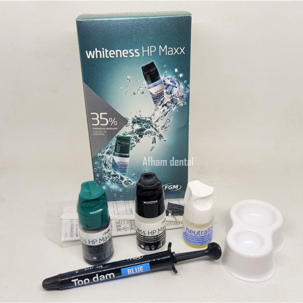 توضیحاتکیت بلیچینگ مطب FGM مدل Whiteness HP Maxxکیت بلیچینگ مطب FGM مدل Whiteness HP Maxxحاوی هیدروژن پراکساید ۳۵% مناسب برای استفاده در مطب می باشد.Whiteness HP Maxxدارای رنگ خاصی است که به عنوان یک سد دفاعی جذب کننده عمل می کند(در حین استفاده از رنگ قرمز به سبز تغییر می کند).وقتی نور به آن می رسد ، انرژی نورانی را تبدیل به انرژی حرارتی می کند که خود باعث تسریع در نفوذ پروکساید به داخل ساختار دندان می شود.ویژگی ها:مناسب برای دندان های وایتال و نان وایتالحاوی تینت به منظور تسریع کردن (Accelerate) فرآیند سفید کردن دندانتینت با جذب نور، از رنگ آجری (کارمن – Carmine) به سبز تغییر رنگ داده و نور جذب شده را به انرژی گرمایی تبدیل کرده و باعث افزایش قدرت نفوذ هیدروژن پراکساید به ساختار دندان و در نتیجه سرعت فرآیند سفید کردن و بلیچینگ می گردد.سبز شدن رنگ نشان دهنده زمان شستشوی دندان است که این امر از پیگمنتاسیون دندان جلوگیری می نماید.حاوی ماده معدنی Heat blocker برای تجمع امواج گرمایی و ممانعت از اثر مستقیم امواج برروی پالپ و افزایش دمای آن و در نتیجه ایجاد حساسیت در دندانبه صورت دو فاز (پراکساید و تغلیظ کننده) برای درست نمودن ماده به اندازه موردنظر و ممانعت از هدر رفتن مادهقابل استفاده همزمان با درمان بلیچینگ خانگیدارای محلول خنثی کننده (Neutralize) برای مواقعی که پراکساید هیدروژن با لثه بیمار تماس پیدا کرد.قابل استفاده برای تک دندان و یا تمام فکاثر بخشی سریعدارای pH خنثیبدون ایجاد هیچ گونه حساسیتمقرون به صرفهقابل استفاده به دو صورت با لایت و بدون لایتقابل استفاده برای سه بیمارساخت کشور برزیلراهنمای استفاده:1- بطری پراکساید را در یک موقعیت عمودی نگه دارید و درب را به دقت باز کنید.2- با یکاسپاتولمحصول را بخوبی مخلوط کنید.3- بطری تغلیظ کننده را بخوبی تکان دهید تا محتوای آن همگن گردد زیرا در صورت عدم همگن شدن مخلوط، ویسکوزیته ژل کم می شود.*30 دقیقه قبل از استفاده کیت را یخچال خارج نمائید.4- شید موردنظر را انتخاب نمائید.5- مایع رابردم را اپلای و کیور نمائید.6- پراکساید و تغلیظ کننده را مخلوط نمائید.*به ازای هر دندان: سه قطره پراکساید + 1 قطره تغلیظ کننده و برای ده دندان: 21 قطره پراکساید + 7 قطره تغلیظ کننده7- ژل بدست آمده را برروی دندان با ضخامت نیم الی یک میلی متر اپلای نما