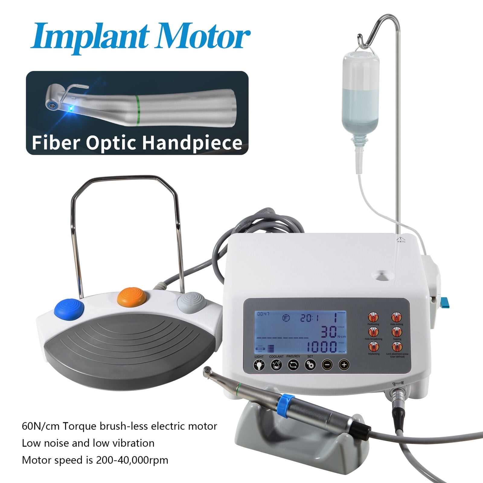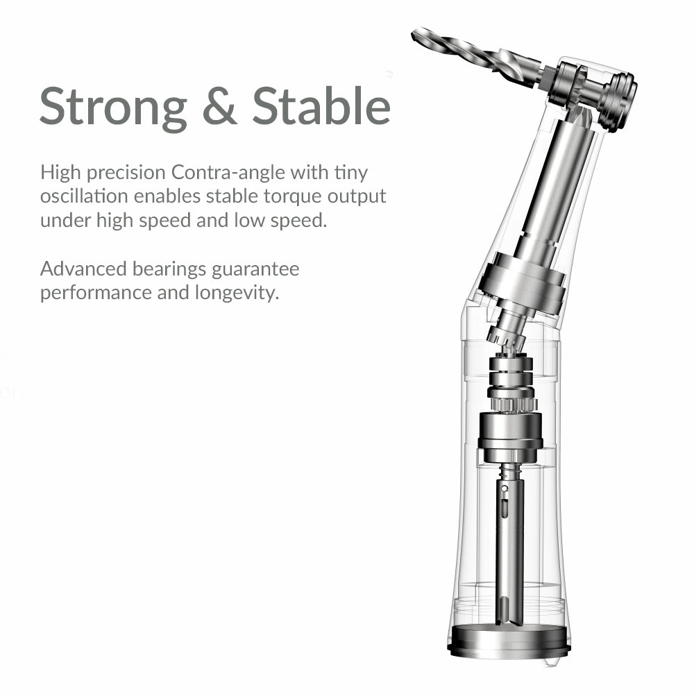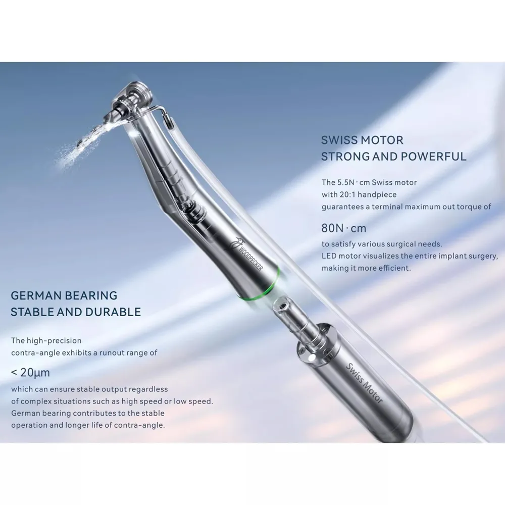 توضیحاتویژگیهای آنگل ایمپلنت وودپیکر 20:1از جمله ویژگیهای آنگل ایمپلنت وودپیکر میتوان به این موارد اشاره کرد:آنگل ایمپلنت وودپیکر برای انواع جراحیهای استخوان فک و جایگذاری فیکسچرها مناسب است.این آنگل دارای گشتاور بالا و قدرت زیادی است.سرعت دریافتی در این انگل ۱ به ۲۰ است (یعنیدر ازای هر ۲۰ بار چرخش میکروموتور، آنگل ایمپلنت یک دور میچرخد)آنگل ایمپلنت وودپیکر از بلبرینگهای آلمانی ساخته شده استدارای بیشینه گشتاور 7۰ نیوتن بر سانتیمتر استسرعت ۲۰۰۰ دور بر دقیقه داردفرز این آنگل از نوع پوش باتن استمجهز به کارتریج بلبرینگی استآنگل ایمپلنت وودپیکر پوش باتن غیر نوری ویژه جراحیهای ایمپلنت استاین آنگل بر روی دستگاههای ایمپلنت یا سامانههایی با گشتاور بالا و سرعت کم مورد استفاده قرار میگیردهندپیس از نوع غیر نوریکارتریج از نوع بلبرینگی سرامیکیفرز از نوع فشاریدارای گشتاور ۷۰ نیوتن بر سانتیمترنوع چرخش ۳۶۰ درجهسامانه آب از نوع آب از خارجقابلیت اتوکلاو شدن به مدت ۲۰ دقیقه در دمای ۱۲۱ درجه سانتیگراد یا ۱۵دقیقه در دمای ۱۳۴ درجه سانتیگرادقابلیت نصب بر روی انواع ایروتور و میکروموتوردارای استاندارد CE اروپا، FDA آمریکا و ISOدارای یک سال گارانتی و ۱۰ سال خدمات پس از فروشساخت چینمهمترین شاخصهای عملکرد آنگل ایمپلنت وودپیکرجهت زاویهدار بودن آن؛ که باعث افزایش قدرت مانور دندانپزشک شده است.مهندسی دقیق هندپیس ایمپلنت که باعث کنترل و گشتاور دقیق آن و به حداقل رسیدن خطای سرعت و همچنین اطمینان از تراز دقیق ایمپلنت گردیده است.سازگاری این آنگل ایمپلنت با طیف گستردهای از سامانهها و اجزای ایمپلنت دندان.سازگاری استریلیزاسیون این ایمپلنت که باعث کاهش چشمگیر خطر عفونت پس از عمل جراحی شده است.مکانیزم پیوست. این انگل دارای مکانیزم اتصال ایمن است که درایور ایمپلنت یا آداپتور هندپیس را در طول عمل کاشت ایمپلنت بهطور ثابت و مستحکم نگه میدارد تا هیچگونه لغزش یا جابجایی درایور صورت نگیرد.