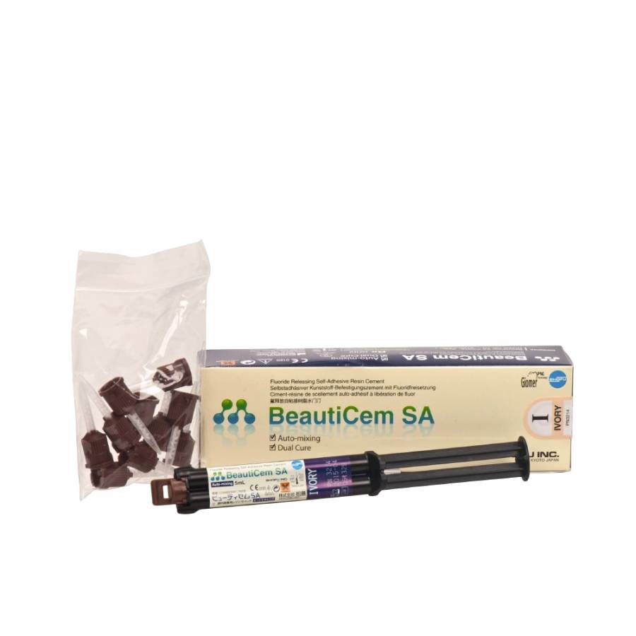 سمان گلاس آینومر رزینی بیوتی سم - BeautyCem SA:BeautiCem SA یک سیمان رزینی خود اچ، خود چسب و دوال کیور است که به راحتی، سریع و مطمئن به دنتین و انامل، فلزات، سرامیک و رزین های کامپوزیت غیرمستقیم، بدون نیاز به باندینگ جداگانه یا اچینگ اسید فسفریک می چسبد. BeautiCem SA با حذف این مراحل حساس به تکنیک و ارائه یک سیستم آسان، چسبندگی سیمان را به حداکثر می رساند. این محصول در یک سرنگ دو قلو با mix tip های خودکار عرضه می شود که به طور مداوم سیمان را با نسبت صحیح و بدون هیچ گونه درگیری هوا مخلوط میکند.علاوه بر این، BeautiCem SA به لطف ذرات فیلر اختصاصی S-PRG SHOFU، فلوراید را آزاد و مجدداً شارژ میکند.ساختار GIOMER:بر اساس فناوری (PRG (Pre-Reacted Glass-ionomer یک فاز پایدار از گلاس آینومر تشکیل میشود تا بدون ایجاد تخریب مواد مزایای بیشتری مانند آزادسازی فلوراید و شارژ مجدد را در مواد ترمیمی ایجاد کند.آزادسازی و شارژ مجدد فلوراید:فیلر (S-PRG (Surface Pre-Reacted Glass-ionomer حاوی فاز پایدار گلاس آینومر با قابلیت آزادسازی و شارژ مجدد فلوراید است که به غلظت فلوراید در دهان پاسخ می دهد و در عین حال استحکام و پایداری رزین کامپوزیت را حفظ میکند.استحکام و دوام قابل توجه:دو مونومر دوگانه چسب BeautiCem SA، چسبندگی قوی به ساختار طبیعی دندان را تضمین میکند و تمام مواد ترمیمی غیرمستقیم یا انواع ترمیمها را به صورت چسب سیمان میکنند. این کاتالیزور نوآورانه فرآیندهای پلیمریزاسیون را که در رزین انجام میشود در هر دو حالت Self Cure و Dual Cure بهینه میکند. این به BeautiCem SA خواص مکانیکی برتر می دهد و مقاومت بالایی در برابر استرس اکلوزالی برای ترمیم های طولانی مدت تضمین میکند. علاوه بر این، رادیوپاسیتی عالی تشخیص را در معاینات بعدی تسهیل میکند.مارجین های تقریبا نامرئی:BeautiCem SA یک سیمان رزینی با ویسکوزیته ایده آل است، به این صورت که خیلی نازک نیست و کنترل آن راحت است و امکان قرار دادن دقیق ترمیم را فراهم می کند. به لطف حالت فلو تیکسوتروپیک، یک لایه یکنواخت و بدون حباب را تشکیل میدهد که فقط 11/8 میکرومتر ضخامت دارد و مارجینهای ترمیم را تقریباً غیرقابل تشخیص میکند. مواد اضافی به راحتی “در یک تکه” با قوام لاستیکی پس از یک لایت کیور مختصر یا حدود 3-4 دقیقه سلف کیور شدن جدا میشو