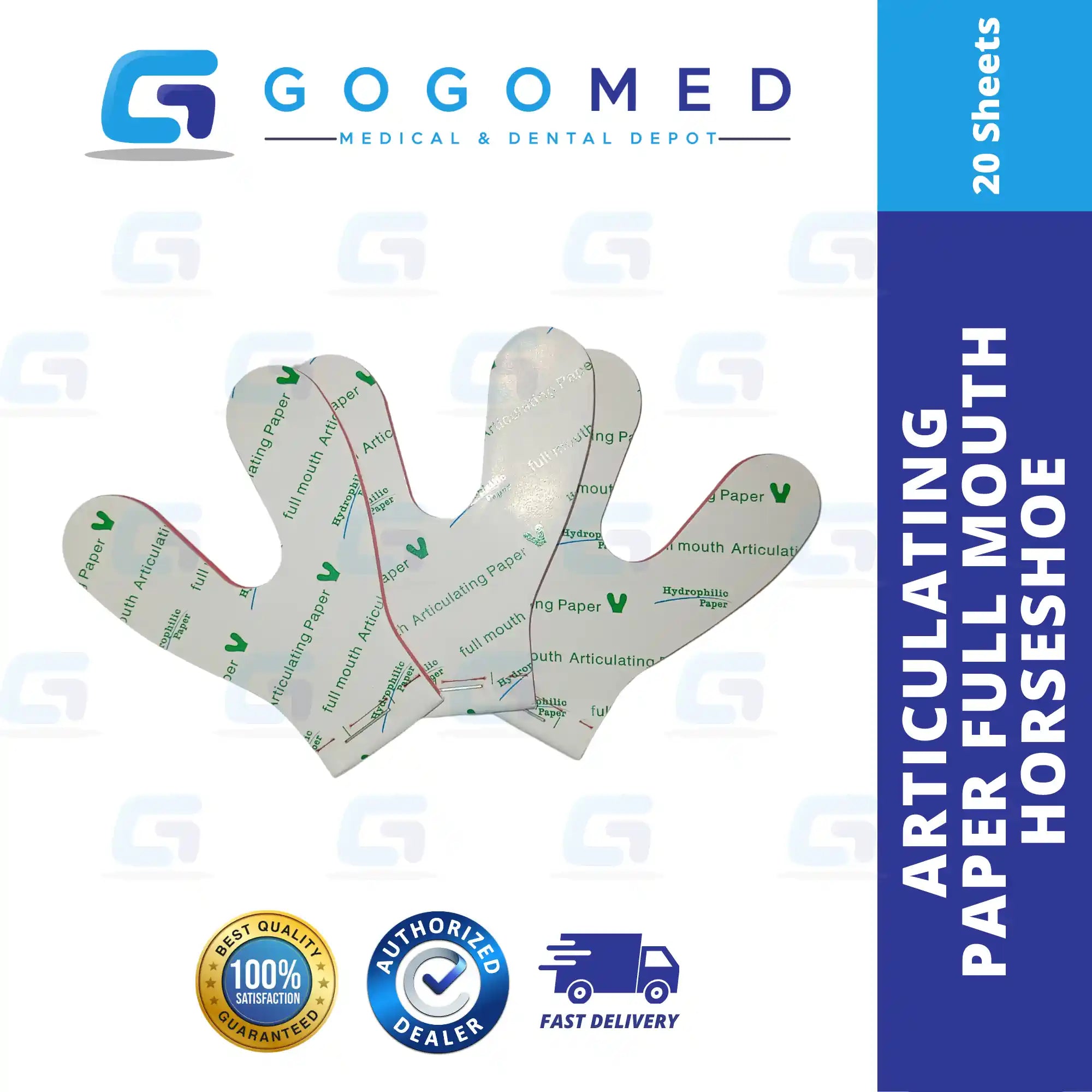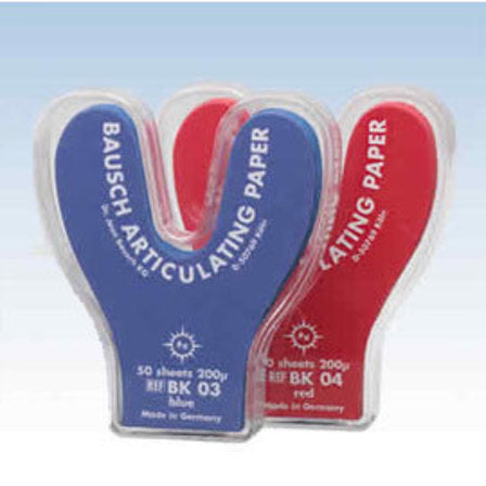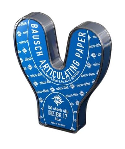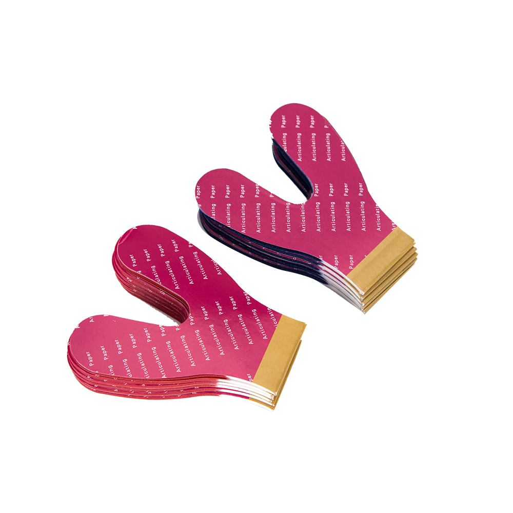 کاغذ آرتیکولاسیون نعل اسبی -HorseshoeArticulating Paper :مقاوم در برابر پارگی و غیر چسبنده است.با قرار گیری روی دندان و با توجه به سطح رنگ شده ، پزشک میتواند به بلندی یا کوتاهی دندان پی ببرد.کاغذ آرتیکولاسیون نعل اسبی برند (HDA) ساخت ترکیهحاوی12 شیت 12 عددی در دو رنگ آبی و قرمزعرضه میگردد.