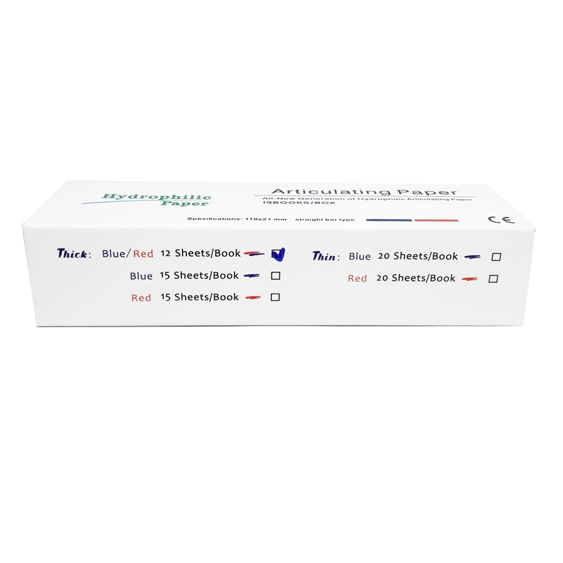 کاغذ آرتیکولاسیون مستقیم - Straight Articulating Paper:مقاوم در برابر پارگی و غیر چسبنده است.با قرار گیری روی دندان و با توجه به سطح رنگ شده ، پزشک میتواند به بلندی یا کوتاهی دندان پی ببرد.کاغذ آرتیکولاسیون مدل مستقیم(Straight)از برند(HDA)ساخت ترکیه در بستههای حاوی12 شیت 12 عددیآبی و قرمز عرضه میشود.