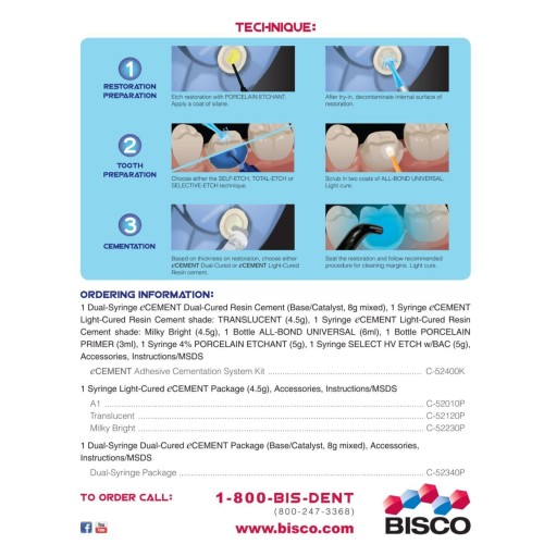 معرفی سمان رزینی لایت کیور e-Cement بیسکوسمانها در دندانپزشکی کاربردها مختلفی دارند. بههمین دلیل تنوع این محصول بسیار بالا است. درواقع هرنوع سمان برای گروهی از انواع ترمیمهای درمانی یا زیبایی کاربرد دارد. برایمثال سمان رزینی لایت کیورe-Cementبیسکوجهت ترمیمهای لیتیم دی سیلیکات و چسباندن لمینتهای پرسلنی ساخته شده است. البته این سمان کاربردهای دیگر نیز دارد.ویژگیهای سمان رزینی لایت کیور e-Cement بیسکوسمان رزینی لایت کیور e-Cement بیسکوبا ویژگی flowable خود کاملا فضای موجود برای سمان را پر میکند.Porcelain primer موجود در این سمان، نقش سایلن را برای لیتیم دی سیلیکات را بازی کرده و آن را برای سمان نمودن روکشهای eMax قدامی بسیار مناسب میسازد.قابلیت تحمل فشار این سمان بسیار بالا بوده و دربرابر فشارهای کششی نیز استحکام لازم را دارد.ثبات رنگ این سمان باعث شده است که در سمان کردن ونیرهای چینی، زیرونیکا و کامپوزیت هیچ نگرانیای برای دندانپزشک وجود نداشته باشد.تنوع رنگ این سمان رادیواپک امکان انتخاب رنگ را نیز ایجاد میکند.از سمان eCement Light Cured برای ترمیمهای لیتیم دی سیلیکات (e-MAX) و رادیواپک است. این سمان Film Thickness پایین و خاصیت فلو دارد.جزء لایت کیور مناسب برای ترمیم دندانهای قدامی و نفوذ تا ضخامت ۲ میلیمترمناسب چسباندن روکشهای e-MAX قدامیبرای مشاهدهقیمت و خرید سمان دندانپزشکیبه وبسایتفروش ابزار و مواد دندانپزشکی دنتیوامراجعه کنید و محصول خود را با بهترین کیفیت و تضمین اصالت کالا خریداری نمایید.