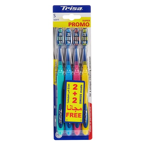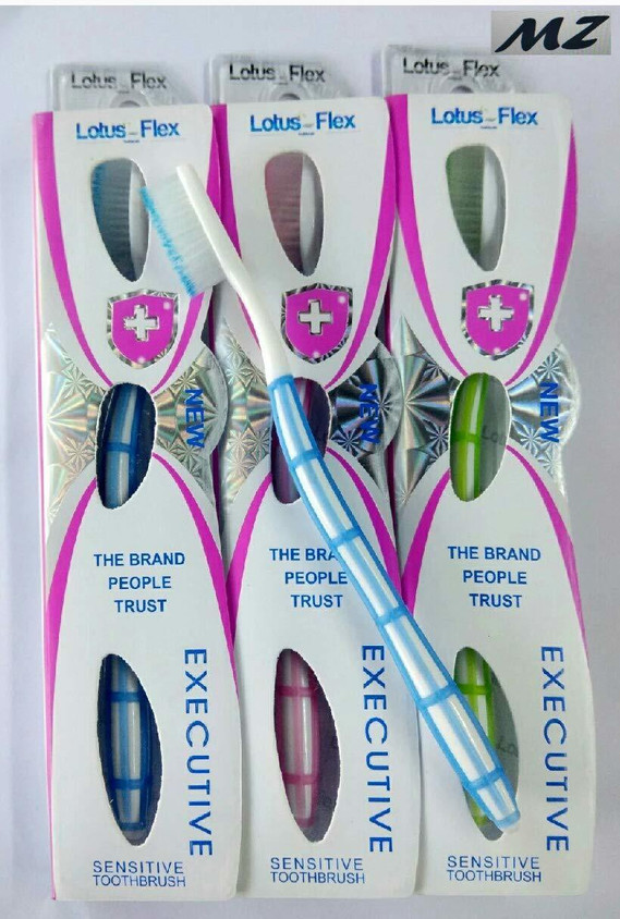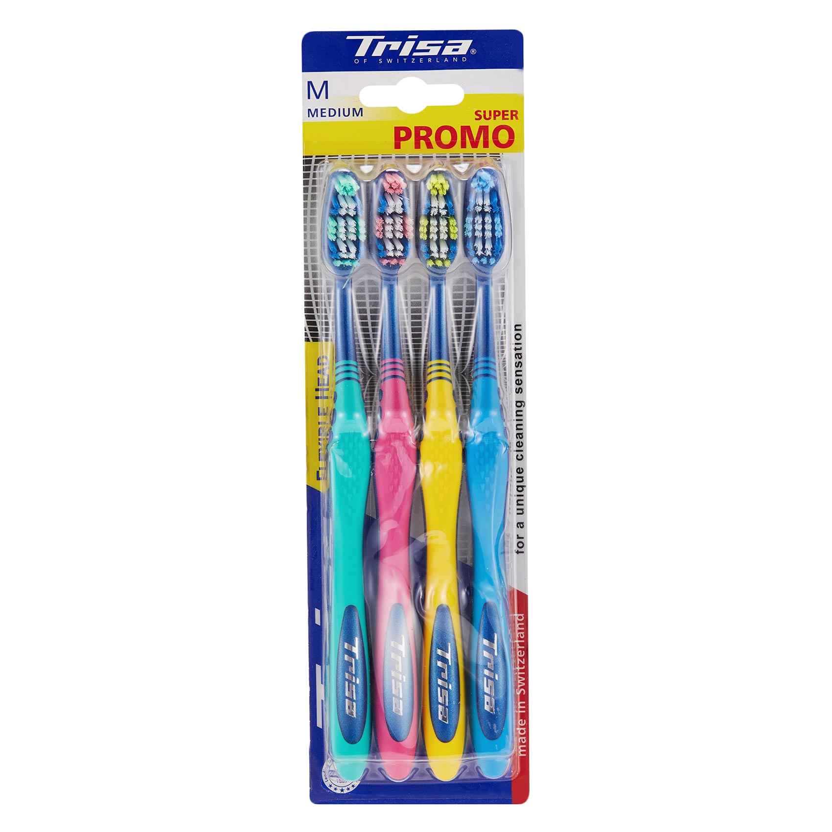مسواک فلکسیبل هد - Flexible Head Toothbrush:برس به صورت انعطاف پذیر با 2 عدد لولا جهت باز شدن هنگام مسواک زدن و کاهش فشار وارده بر دندان و لثه، طراحی و ساخته شده است.دارای یک ردیف الیاف بلند نوک برس مسواک جهت پاکسازی دندان های عقبی و خلفی است.به منظور تمیزی بهینه دندان ها و فضای بین آن ها، الیاف به صورت منحصر به فردی چیدمان شده است.دسته آن به صورت W شکل طراحی شده است که مطابق با ارگونومی دست باشد.دارای زبان پاک کن برای از بین بردن باکتری های روی زبان و برطرف نمودن بوی بد دهان است.مسواک فلکسیبل هد برند تریزادر دو مدل متوسط و نرم و بسته های 4 عددی عرضه می گردد.