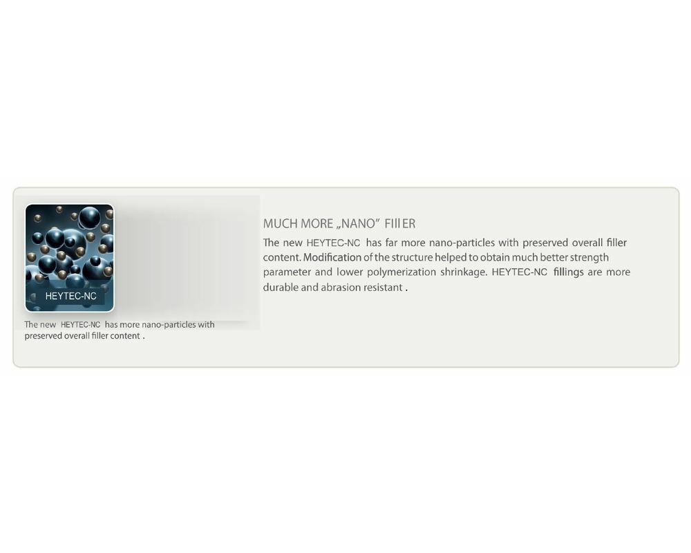 توضیحاتماده ساخت روکش موقت با خواص زیبایی فوق العاده برای ساخت روکش موقت و بریج های اینله ،آنله و ونیرآماده سازی و استفاده آسانماده ساخت روکش موقت HeyTEC Temp به صورت Auto mix میباشد.که یکنواختی مواد را تضمین می کند از تشکیل حباب های هوا جلوگیری شده و ریسک ایجاد شکاف به حداقل می رسدکنترل شدت لایت کیور امکان کاربرد آسان را در داخل و خارج دهان بیمار فراهم میکند