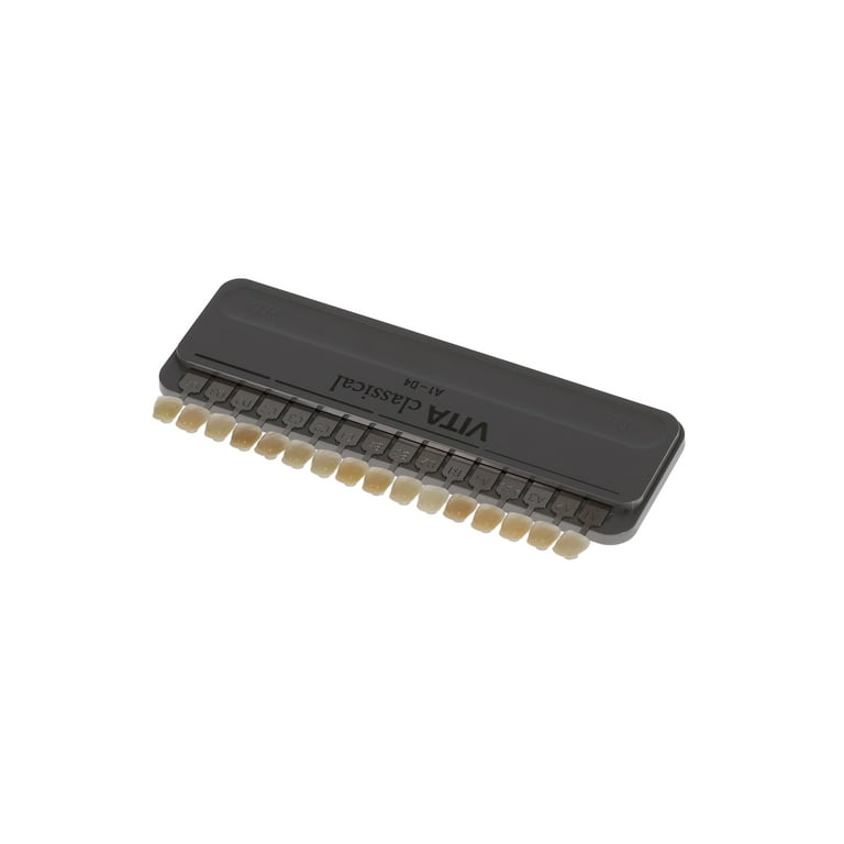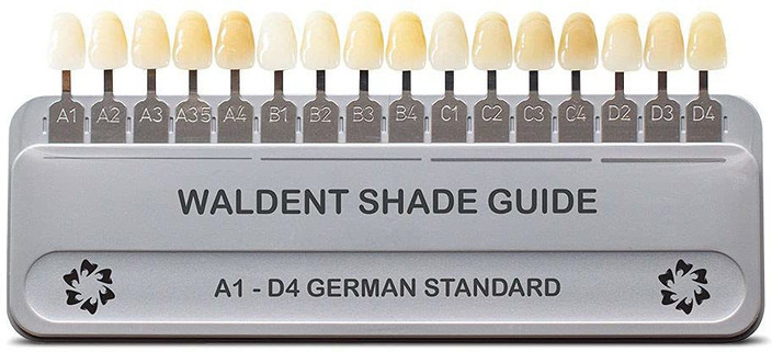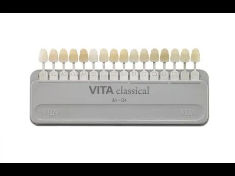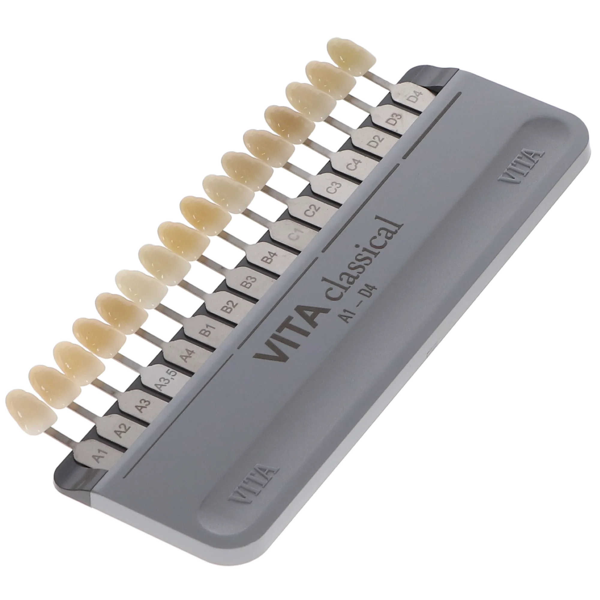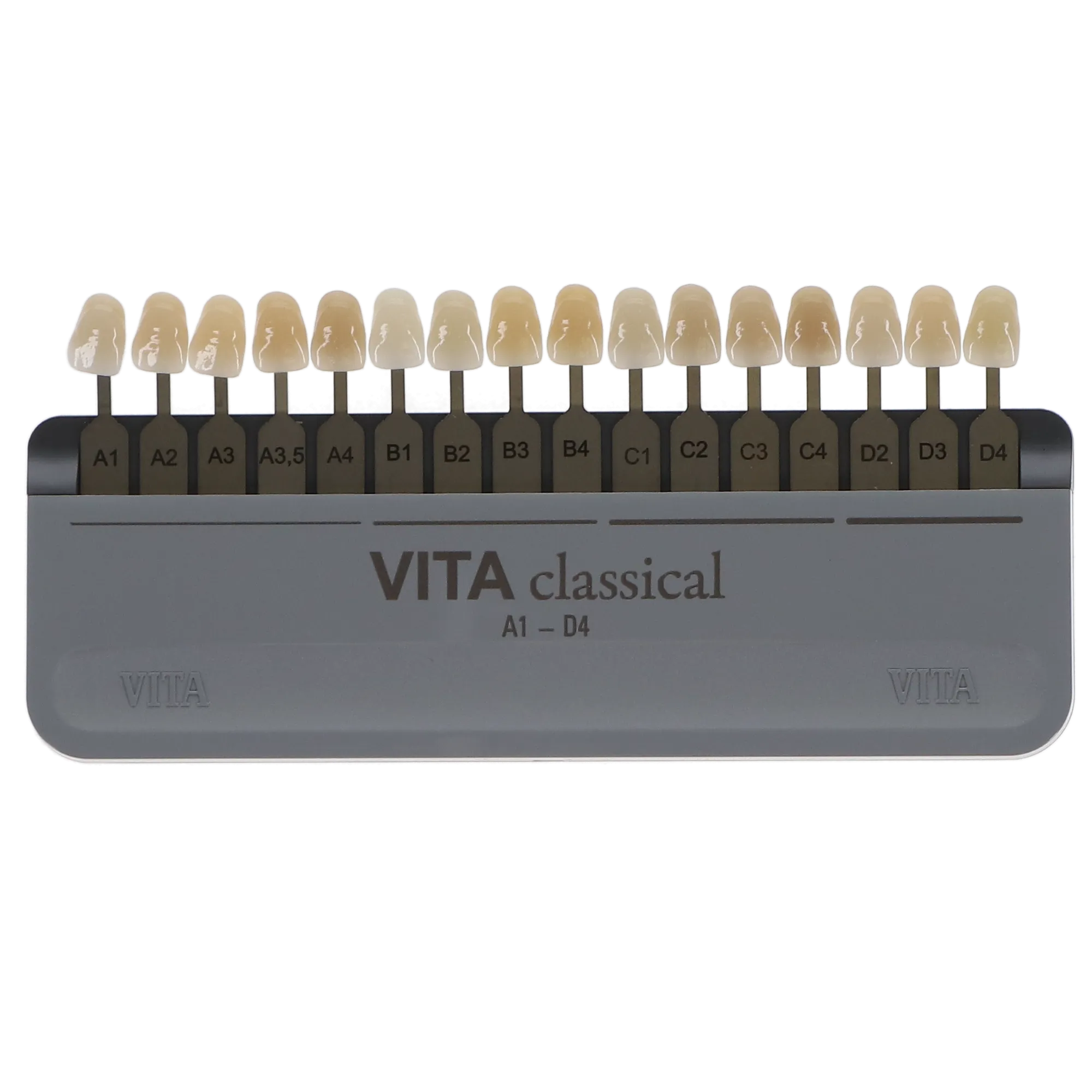 کاربرد شیدگاید کلاسیک VITAامروزه با عرضه طیفهای رنگی وسیعتر کامپوزیتها و لمینتهای دندان، گزینههای انتخاب رنگ مناسب برای هر بیمار گستردهتر شده است. بهاین معنی که حالا میتوان لمینت یا کامپوزیت دندان بیمار را باتوجه به رنگ پوست، فرم لبخند، اندازه دندانها و نظر خود بیمار انتخاب نمود. شید گاید، نمونه رنگ یا کیت راهنمای رنگ تجهیزاتی است که برای انتخاب رنگ مناسب لمینت یا هر روش ترمیم دندان طبیعی و دندان مصنوعی بهکار میرود. شیدگاید کلاسیک ویتا ابزاری است که به تشخیص دقیق سایه (رنگ دندان ) کمک میکند.سایههای شید گاید کلاسیکترتیب رنگها (سایهها) در شیدگاید کلاسیک VITA به شرح زیر است:A1 – A4 (reddish-brownish)B1 – B4 (reddish-yellowish)C1 – C4 (greyish shades)D2 – D4 (reddish-grey)مزیت این شیدگاید را میتوان در دارا بودن رنگهای کامل و بلیچ دانست.ویژگیهای شید گاید ویتانمونه رنگ ویتا (شیدگاید کلاسیک ویتا) قابلیت ضدعفونی دارد. البته این ضدعفونی بهتر است با مواد و اسپریهای پیشنهاد شده از سوی تولید کننده صورت گیرد.