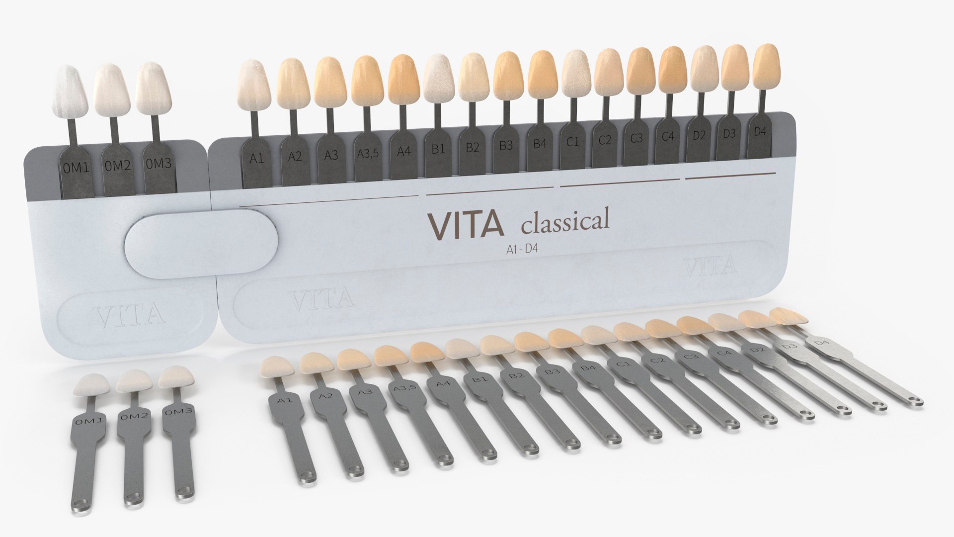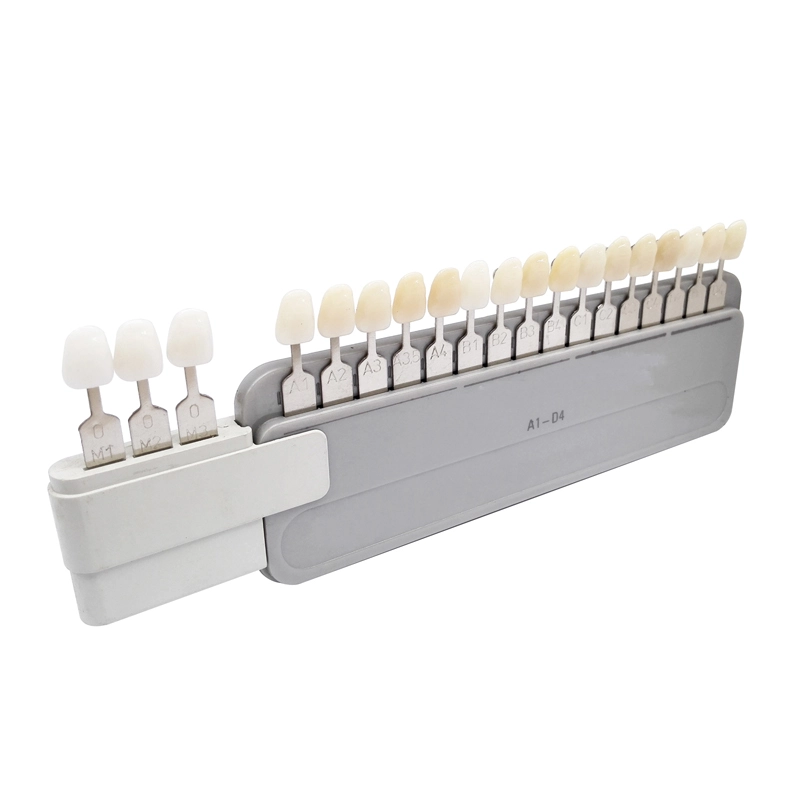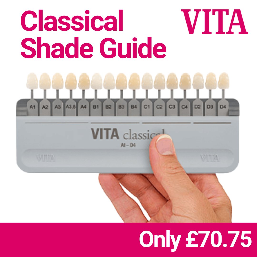 کاربرد شیدگاید کلاسیک VITAامروزه با عرضه طیفهای رنگی وسیعتر کامپوزیتها و لمینتهای دندان، گزینههای انتخاب رنگ مناسب برای هر بیمار گستردهتر شده است. بهاین معنی که حالا میتوان لمینت یا کامپوزیت دندان بیمار را باتوجه به رنگ پوست، فرم لبخند، اندازه دندانها و نظر خود بیمار انتخاب نمود. شید گاید، نمونه رنگ یا کیت راهنمای رنگ تجهیزاتی است که برای انتخاب رنگ مناسب لمینت یا هر روش ترمیم دندان طبیعی و دندان مصنوعی بهکار میرود. شیدگاید کلاسیک ویتا ابزاری است که به تشخیص دقیق سایه (رنگ دندان ) کمک میکند.سایههای شید گاید کلاسیکترتیب رنگها (سایهها) در شیدگاید کلاسیک VITA به شرح زیر است:A1 – A4 (reddish-brownish)B1 – B4 (reddish-yellowish)C1 – C4 (greyish shades)D2 – D4 (reddish-grey)مزیت این شیدگاید را میتوان در دارا بودن رنگهای کامل و بلیچ دانست.ویژگیهای شید گاید ویتانمونه رنگ ویتا (شیدگاید کلاسیک ویتا) قابلیت ضدعفونی دارد. البته این ضدعفونی بهتر است با مواد و اسپریهای پیشنهاد شده از سوی تولید کننده صورت گیرد.