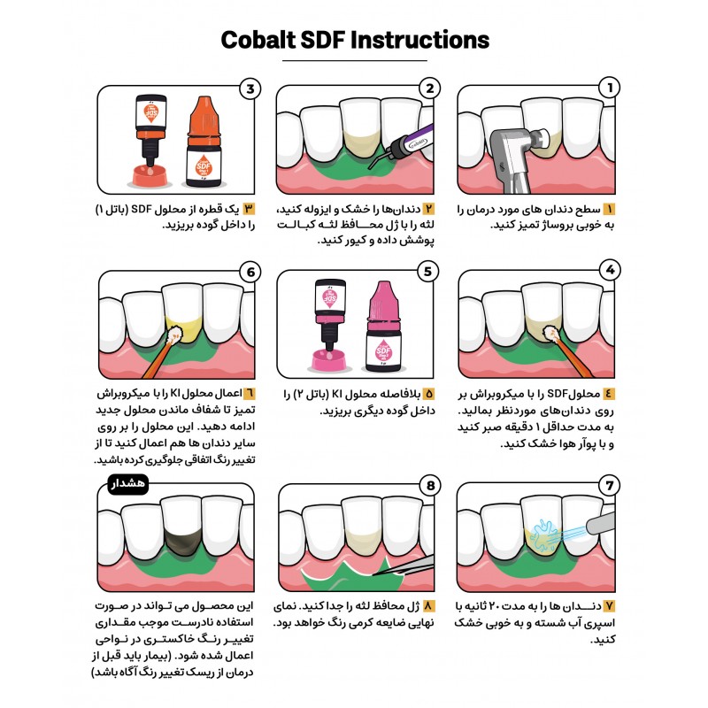محلول نقـره فلوراید - Silver Diamine Fluoride 38%:SDF کبالت مادهای حاوی نقره و فلوراید است که به عنوان عامل ضد حساسیت در پوسیدگیهای عاجی استفاده میشود. این محصول همچنین میتواند به عنوان متوقفکننده پوسیدگیهای شدیدا پیش رونده (rampant caries) استفاده شود. محلول بطری دوم در این محصول حاوی پتاسیم یداید است که میتواند در صورت استفاده صحیح باعث کاهش تغییر رنگ در دندان شود. موارد استفاده: توقف پوسیدگیهای سریع پیش رونده رفع حساسیت عاج سرویکالمحلول نقـره فلوراید (Silver Diamine Fluoride 38%) از برند کبالت در دو مدلStandard PackوSmall Packدر فروشگاه اینترنتی دندانت عرضه میشود.