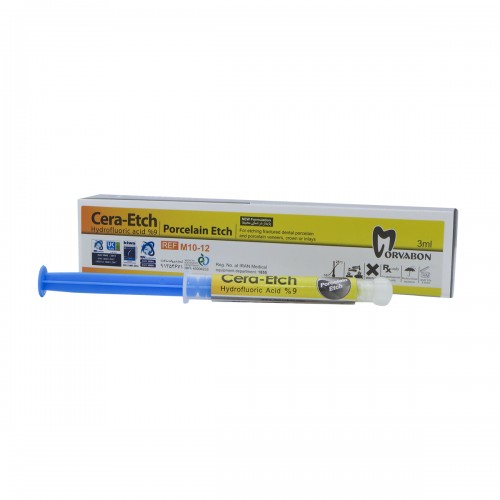 توضیحاتمعرفی:سرانیک ® اچ، ژل اسید هیدروفلوئوریک 9% برای اچ کردن سطح روکش های شکسته پرسلن در داخل دهان می باشد. همچنین محصول برای اچینگ پرسلن ونیر، اینله، آنله، کراون و براکت های ارتودونسی قبل از باندینگ کاربرد دارد.تركيبات:اسید هیدروفلوئوریک، تغلیظ کننده، رنگروش استفاده:لثه و بافت نرم مجاور ناحیه ترمیم را کاملا ایزوله کنید و مطمئن شوید با محصول در تماس نباشد.سطح پرسلن را با فرز مناسب بخوبی تراش دهید.یک لایه سرانیک ® اچ را روی سطح تراش خورده پرسلن قرارداده و شصت ثانیه صبر کنید.ژل را با ساکشن برداشته و سطح را کاملا با پوار آب بشویید.سطح پرسلن باید سفید و زبر شده باشد، درغیر اینصورت مراحل 3 و 4 را تا رسیدن به نتیجه مطلوب تکرار نمایید.توجه:|رطوبت و بزاق حین انجام مراحل، کیفیت ترمیم را کاهش می دهد.|با استفاده از ساکشن در مجاورت ترمیم، مانع از انتشار گاز سمی در حفره دهان شوید.هشدار:|فقط جهت مصرف توسط دندانپزشک|استفاده از رابردم و تجهیزات ایمنی هنگام استفاده از این محصول ضروری است|از تماس محصول با بافت های نرم، چشم و پوست جدا جلوگیری شود، در صورت تماس بلافاصله با پنبه و الکل کاملا پاک کنید و سپس با آب و صابون بشویید|در صورت بلعیدن، مقدار فراوانی آب بنوشید. استفراغ نکنید و به پزشک مراجعه کنید|از خروج کامل محصول از دهان پس از اتمام کار مطمئن شوید.شرایط نگهداری:|در دمای محیط (بین 10 تا 25 درجه سانتیگراد) دور از تابش نور مستقیم نگهداری شود.